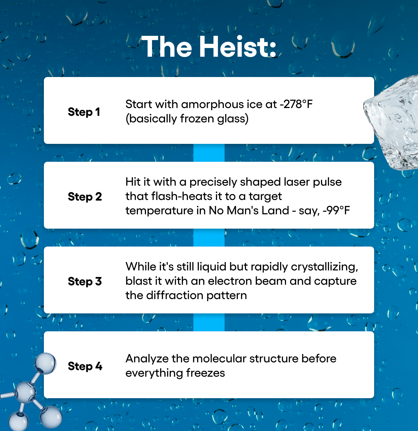 For 40 years, this made no man's land completely inaccessible to direct observation. Scientists could study water above -40°F. They could study amorphous ice (frozen water with a glass-like structure) below -184°F.